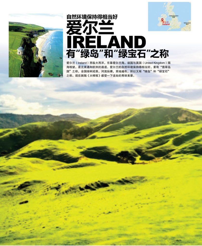 爱尔兰,西临大西洋,东靠爱尔兰海,与英国(United Kingdom)隔海相望,是北美通向欧洲的通道。爱尔兰自然环境保持得相当好,素有“翡翠岛国”之称,全国绿树成荫,河流纵横,草地遍布,所以又有“绿岛”和“绿宝石”之称。该区气候温和,各地的气温相对均衡。