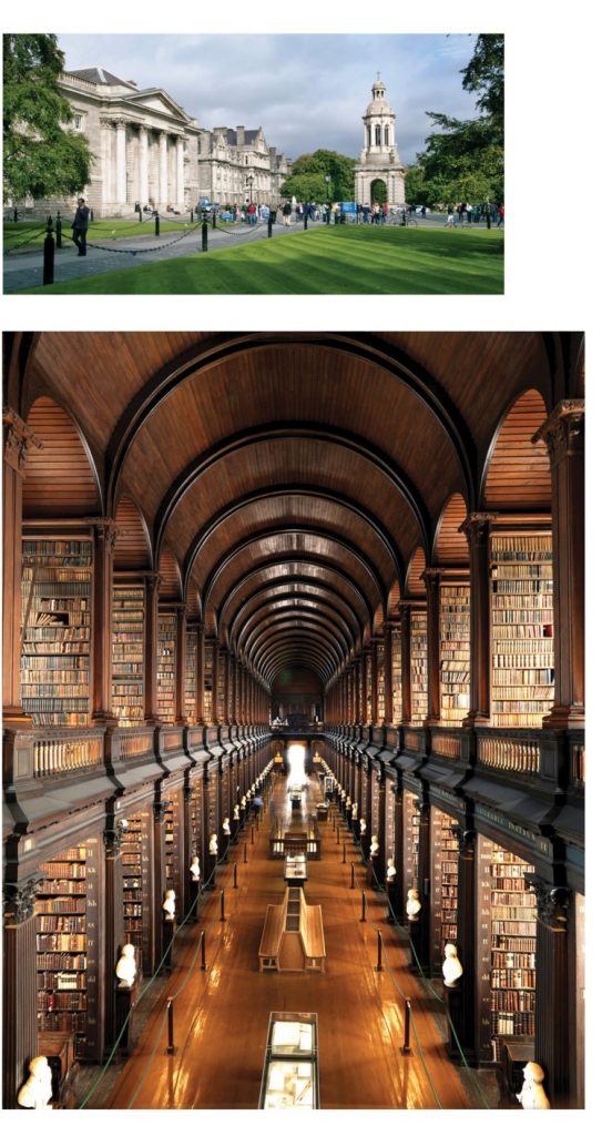 圣三一学院位于都柏林(Dublin)市中心,由伊丽莎白一世于1592年创建,是爱尔兰乃至世界上顶尖的大学之一,在学术界与英国的剑桥、牛津大学齐名。校园里拥有着都柏林最为人陶醉的建筑群,其中的学院图书馆是爱尔兰最古老的图书馆,建立于1592年。图书馆收藏了圣三一学院最古老的书,共有二十多万册藏书,包括《凯尔斯经》、《杜若经》等爱尔兰经典书籍。