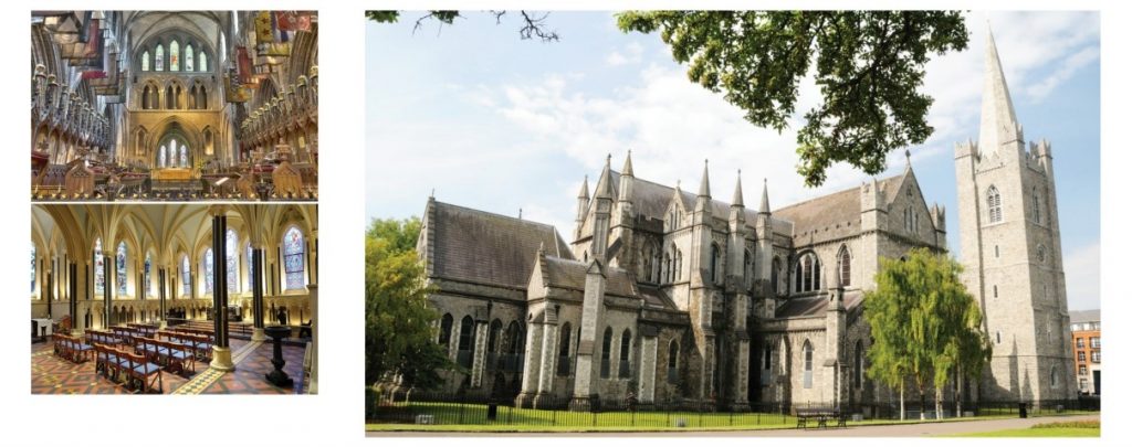 位于都柏林利菲河南岸西侧的圣帕特里克大教堂建立在基督教最古老的起源地。公元4世纪,身为基督教徒的帕特里克因其彪炳的传教成就而被爱尔兰人追封为圣徒,据说他就是在这里的一口古井边受洗并皈依于基督教的。在教堂西侧的钟塔,是1370年间整建时落成的,至今仍收藏着全爱尔兰最大的钟。