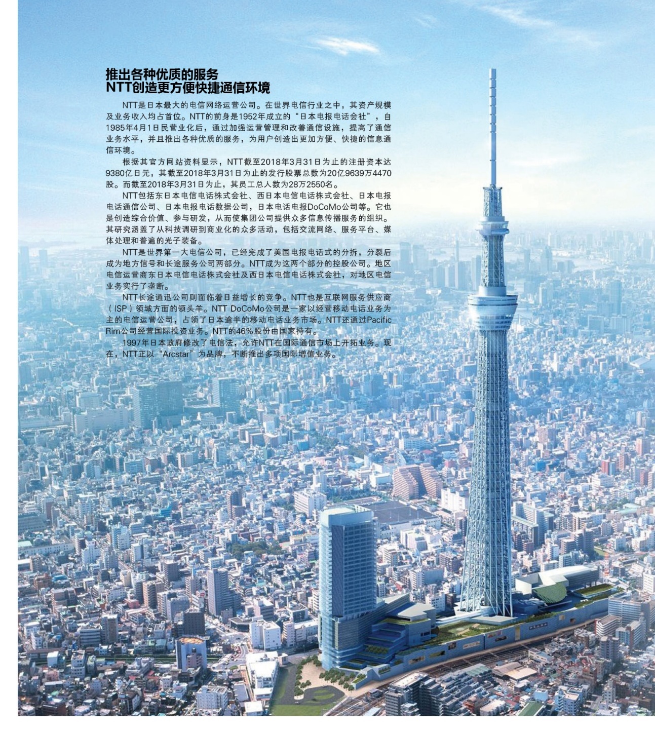 NTT是日本最大的电信网络运营公司。在世界电信行业之中,其资产规模及业务收入均占首位。NTT的前身是1952年成立的“日本电报电话会社”,自1985年4月1日民营业化后,通过加强运营管理和改善通信设施,提高了通信业务水平,并且推出各种优质的服务,为用户创造出更加方便、快捷的信息通信环境。