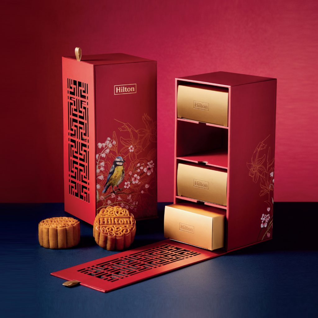 全国性月饼盒设计采用鸟笼风格的4层盒装,具有温暖的色调、鸟和花卉图案,传达出和平与吉祥。开幕式的灵感来自中国建筑艺术,散发着古老的望月体验。该设计有粉红色,红色和蓝色三种颜色可供选择,是最挑剔的家人和朋友最喜欢的礼物。