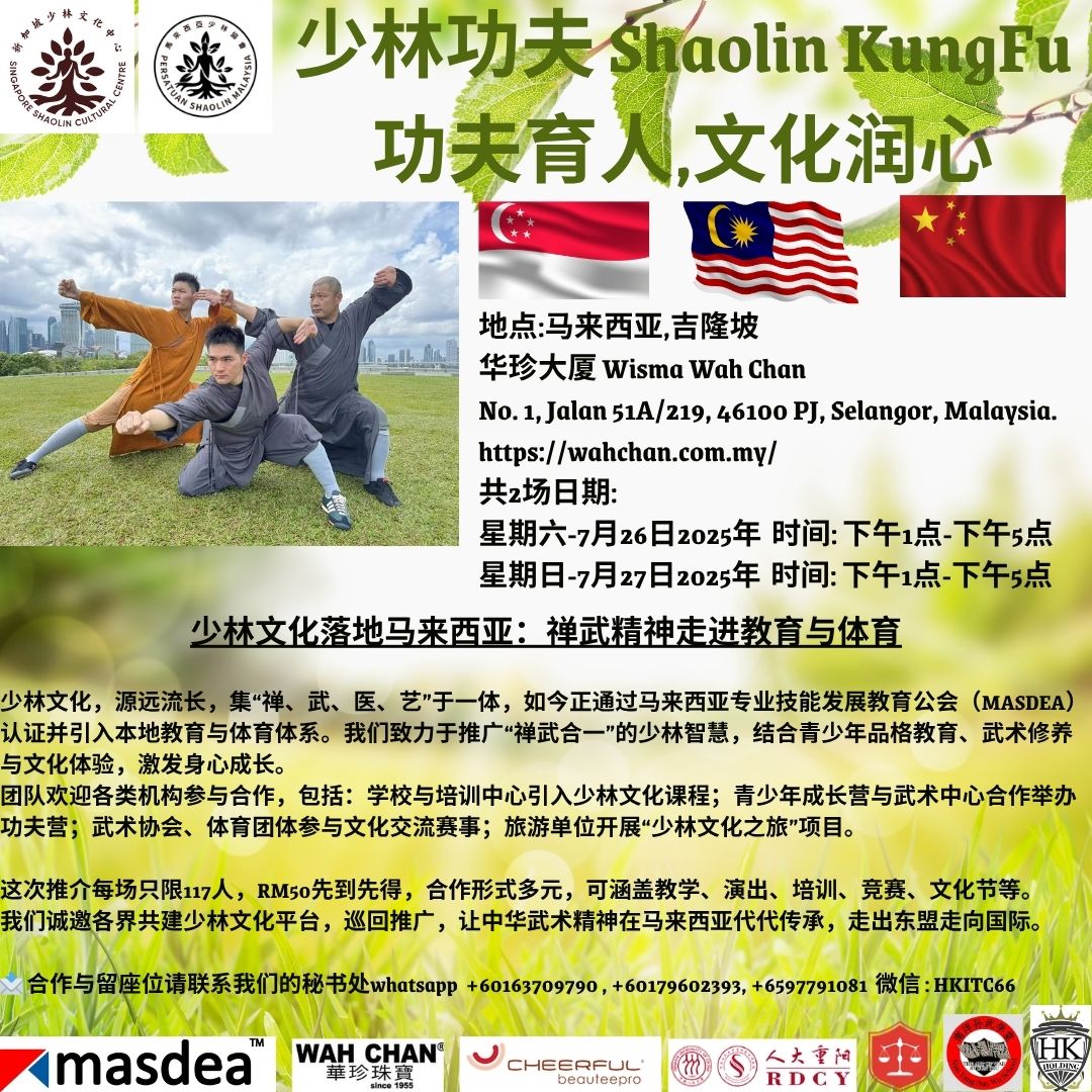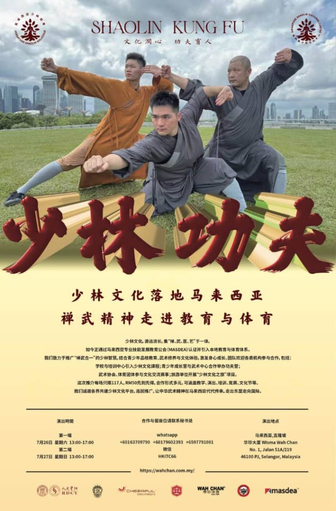 来自中国嵩山少林寺的正宗少林武僧释延荣师父将于7月26日(星期六)及27日(星期日)下午1时至5时,携两位弟子柳森及李翔,亲临八打灵再也华珍珠宝大厦,展开一连两天的少林功夫展演及文化讲座,带领马来西亚民众近距离感受少林文化的独特魅力。