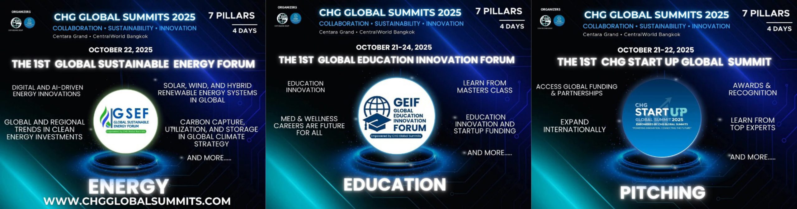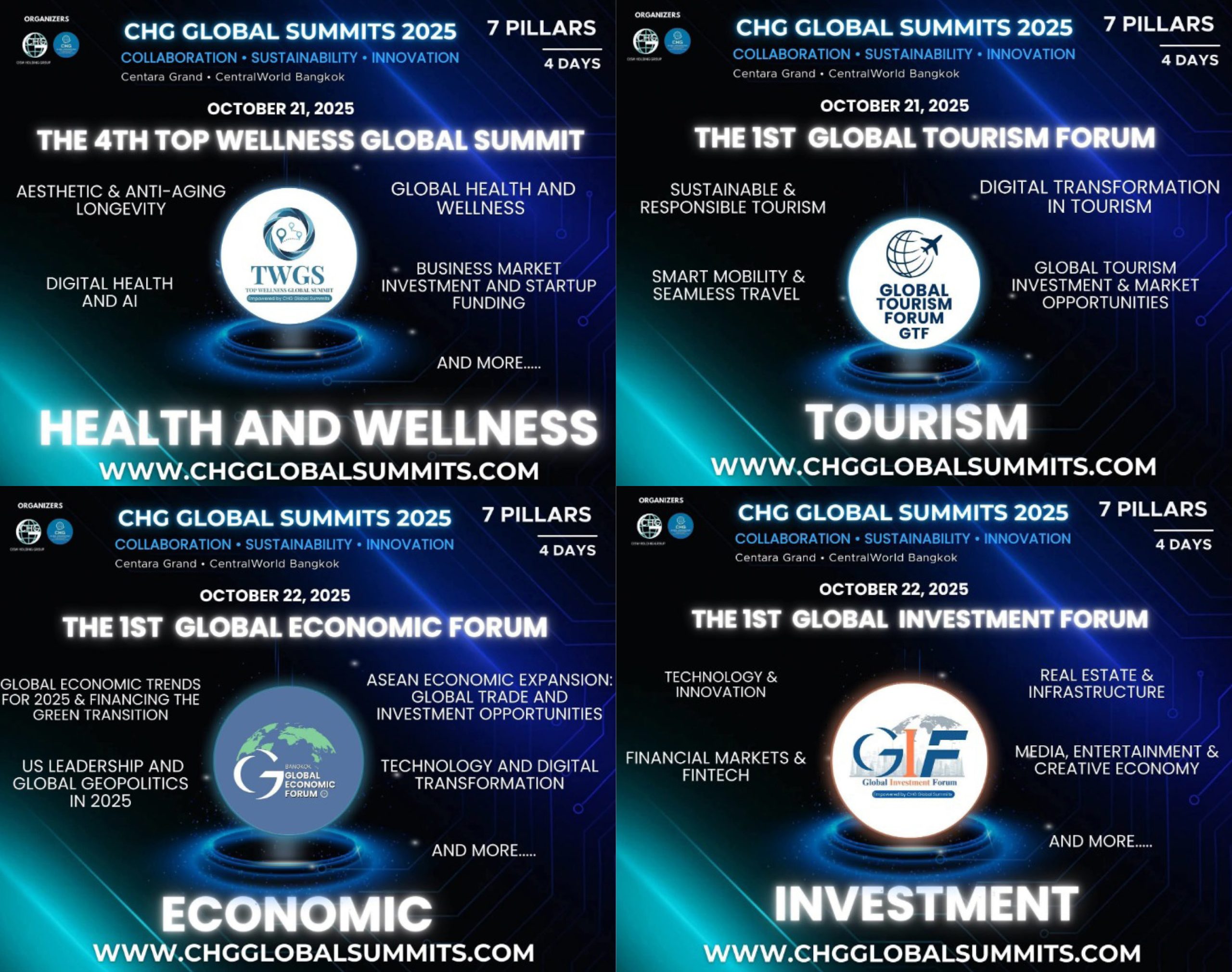 From October 21 to 24, 2025, the world’s attention will turn to Bangkok! Under the theme “Connecting Ideas, Empowering Nations”, the CHG Global Summits 2025 will be grandly held at the renowned Arnoma Grand Hotel, Bangkok. The summit is expected to gather over 200 global leaders, innovators, policymakers, and entrepreneurs from 100 countries, coming together to explore the future of collaboration, sustainability, and innovation.