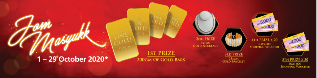 今年10月的这一个月里,在布城亚拉曼达(ALAMANDA)购物中心购物的消费人就有机会赢得各种奖品,包括金条、金项链、金手链以及优惠券,价格从1000至5000令吉,总共有以下53个奖品待赢取: