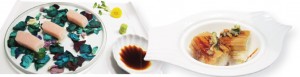 首道菜是北海道(Hokkaido)山药海胆和三文鱼鳟鱼鞑靼,搭配出自婷芭克(Trimbach)世家酒庄的一款迟摘甜白葡萄酒F.E.Trimbach Riesling。第二道是日本野枪鱼生鱼片搭配婷芭克世家珍藏灰皮诺干白葡萄酒F.E.Trimbach Reserve Pinot Gris。此款酒多次获得葡萄酒专业评分机构以及专业人士90分以上的评价。