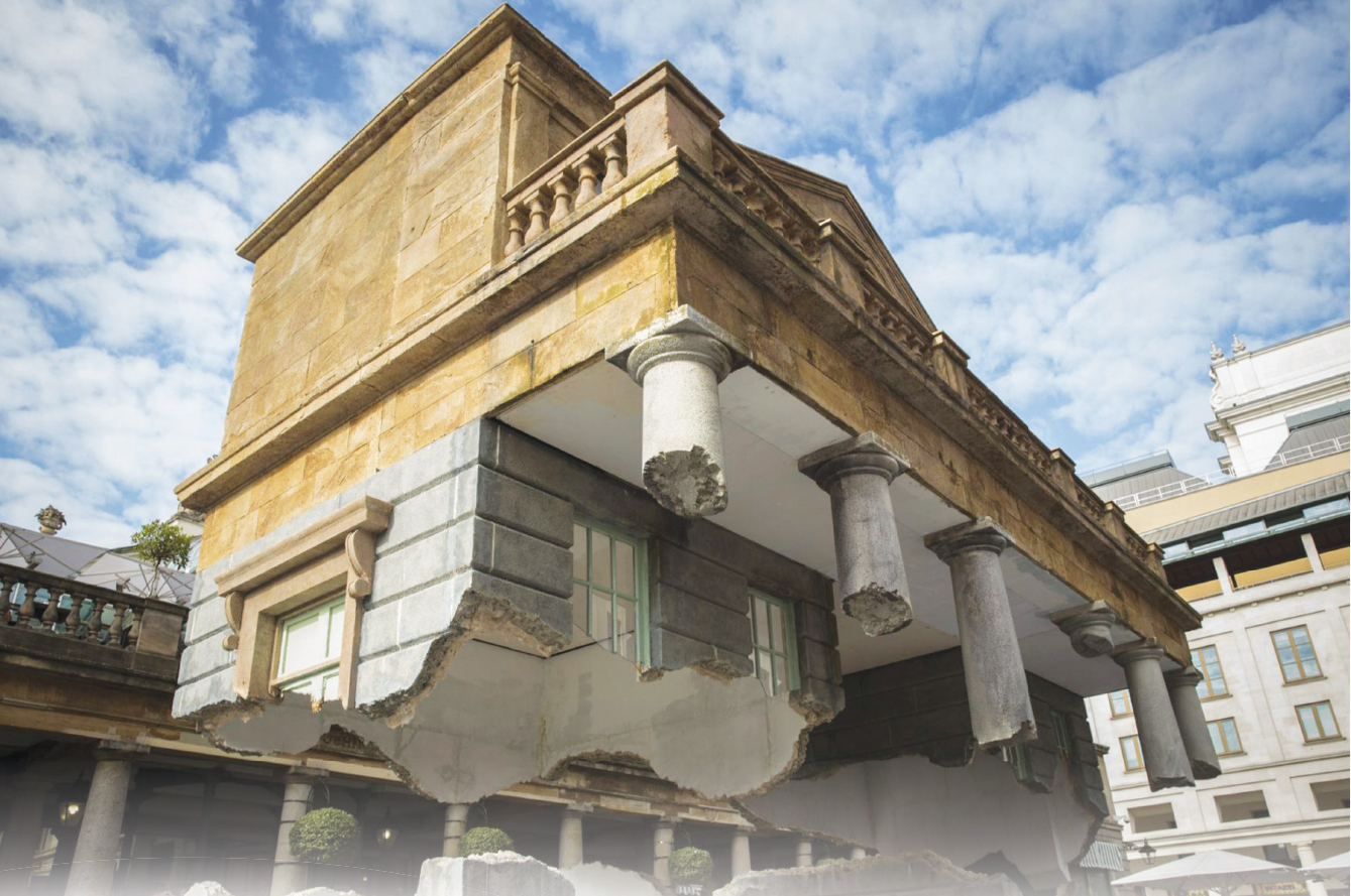 英国(United Kingdom)首都伦敦(London)知名景点、具有184年历史的科芬园市场(Covent Garden),最近邀请艺术家设计了一个以市场建筑为雏型的艺术品,而建筑体中间的梁柱与墙面断裂,远看有飘浮的效果,吸引大批民众围观拍照。