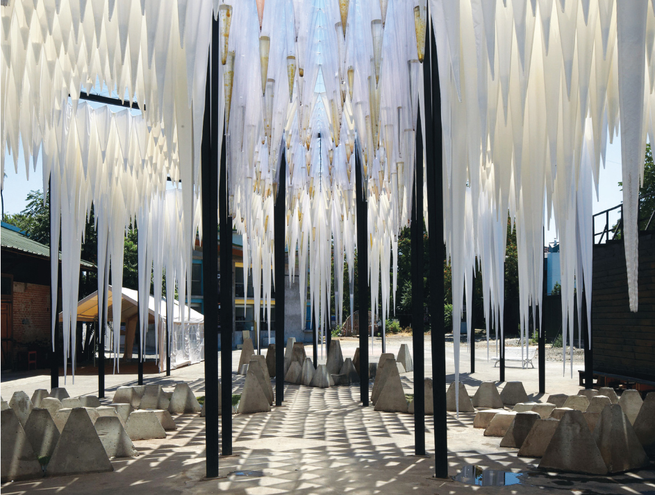 由智利(Chile)和德國(Germany)建筑团队–GUN architects所设计的“水教堂”(Water Cathedral)以水为主要建筑材料,外部以钢筋为主要框架,利用布料织物与塑料纸模仿洞穴中的钟乳石和石笋,倒锥体形状的容器将雨水收集到塑料袋内,然后以不同的速度滴下,倒锥形的帷幕与水滴,为游客提供一个凉爽的氛围。现在就随《大橙报》来一睹这间建筑物的面貌。