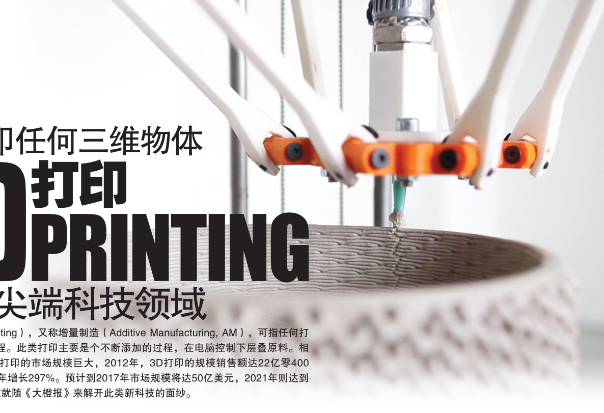 3D打印(3D printing),又称增量制造(Additive Manufacturing,AM),可指任何打印三维物体的过程。此类打印主要是个不断添加的过程,在电脑控制下层叠原料。相关数据显示,3D打印的市场规模巨大,2012年,3D打印的规模销售额达22亿零400万美元,较2011年增长297%。预计到2017年市场规模将达50亿美元,2021年则达到108亿美元。现在就随《大橙报》来解开此类新科技的面纱。