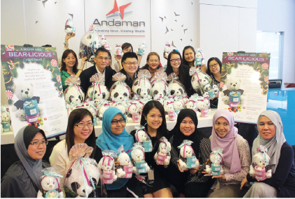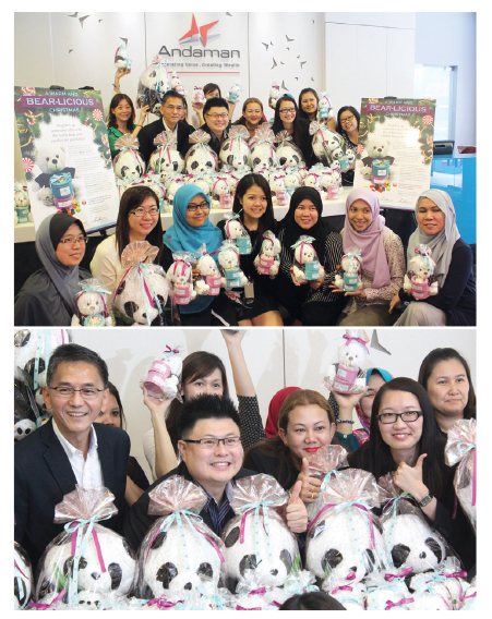 安达集团与帝盛酒店集团皆鼓励旗下员工购买总共90个“Bear-licious”和15个“Panda-licious”的佳节套装赠礼,从中所筹得的义款将移交给位于马来西亚吉隆坡蕉赖(Cheras,Kuala Lumpur,Malaysia)的Rumah Sayangan-这间收容所目前收容了18名来自弱势家庭,曾受虐待,被遗弃和不幸成为孤儿的儿童。