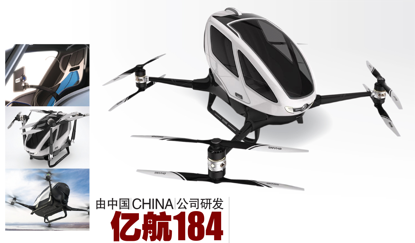 美国拉斯维加斯城(Las Vegas,United States)近期举行的“2016国际消费类电子产品展览会”(CES 2016)上,中国(China)的无人机制造商–亿航公司(Ehang)展示了世界首架可搭载人的飞行器–亿航184(Ehang 184)。