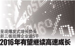 作为多层次资本市场中重要的新生力量,中国(China)新三板市场在刚刚过去的2015年呈现爆发式增长势头,挂牌企业数量一举突破5000家,市场规模快速增长。业内人士表示,随着相关支持政策的继续出台并不断完善,2016年新三板市场有望继续保持高速成长。