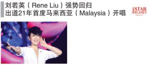 出道21年,“文艺天后”刘若英(Rene Liu)首度登上马来西亚(Malaysia)舞台。由星艺娱乐Star Planet联合Live Nation主办,2016年10月1日晚上8点半,全新巡演“刘若英《RENEXT我敢》世界巡回演唱会”在云顶云星剧场引爆!
