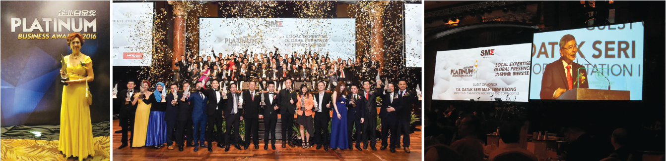 马来西亚中小企业公会(SMEAM)于2016年10月28日在马来西亚雪兰莪州(Selangor,Malaysia)的双威度假村与温泉酒店第15层楼的大泻湖会客厅(Grand Lagoon Ballroom,Level 15,Sunway Resorts & Spa Hotel),主办“2016年度企业白金奖(Platinum Business Awards 2016)颁奖典礼暨晚宴”,共颁发19个奖项予实至名归的优秀企业。