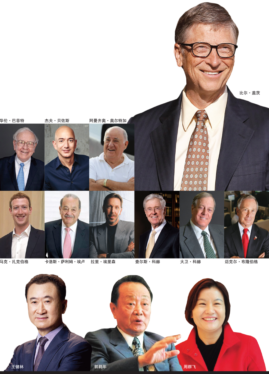 排在榜单前10位的还包括:面子书(Facebook)创始人马克·扎克伯格(Mark Zuckerberg)(560亿美元)、墨西哥(Mexico)富豪卡洛斯·萨利姆·埃卢(Carlos Slim Helu)(545亿美元)、甲骨文公司(Oracle)联合创始人拉里·埃里森(Larry Ellison)(522亿美元)、查尔斯和大卫·科赫兄弟(Charles Koch & David Koch)(483亿美元)、前纽约市长迈克尔·布隆伯格(Michael Bloomberg)(475亿美元)等。