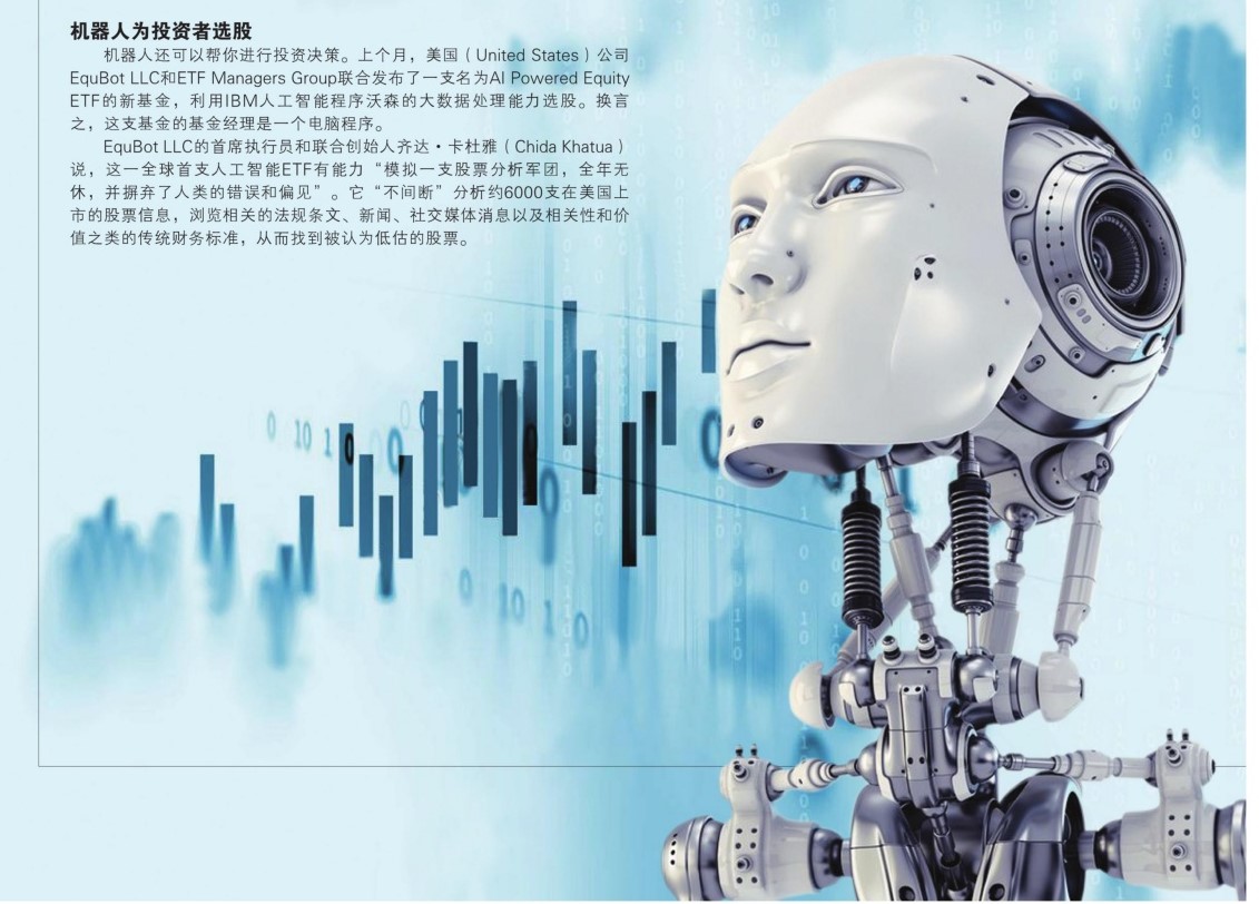 机器人还可以帮你进行投资决策。上个月,美国(United States)公司EquBot LLC和ETF Managers Group联合发布了一支名为AI Powered Equity ETF的新基金,利用IBM人工智能程序沃森的大数据处理能力选股。换言之,这支基金的基金经理是一个电脑程序。