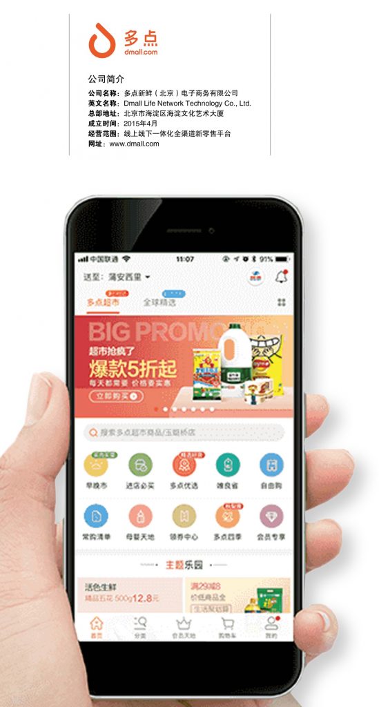 随后,多点Dmall调整策略,确立了绑定线下商超、稳扎稳打的模式。在北京、上海、天津、杭州四个城市,多点Dmall与当地大型商超物美达实现深度结合,为顾客提供了高品质、低价格、2小时送达的优质服务。2017年3月份,多点Dmall在两周年庆上明确战略,锁定“多点+X”经营模式,并宣布将与物美在华东地区实现深度一体化。