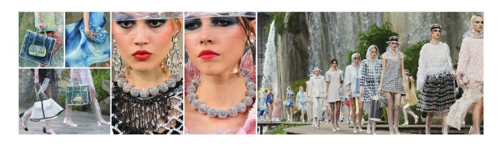 2017年10月3日,香奈儿(Chanel)2018春夏高级成衣系列发布会在法国巴黎(Paris,France)大皇宫举行。这一次,卡尔·拉格斐在大皇宫内搭建起盛大的瀑布景观,高山石嶂,流水奔腾,令人想起法国南部拥有许多美丽瀑布的韦尔东大峡谷(Gorges du Verdon)。