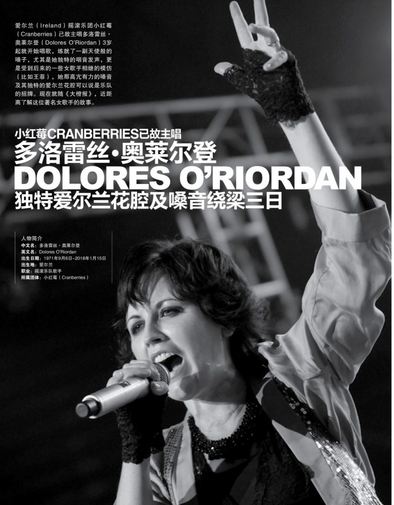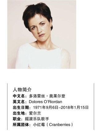 爱尔兰(Ireland)摇滚乐队小红莓(Cranberries)主唱多洛雷丝·奥莱尔登(Dolores O’Riordan)于2018年1月15日在伦敦(London)去世,终年47岁。