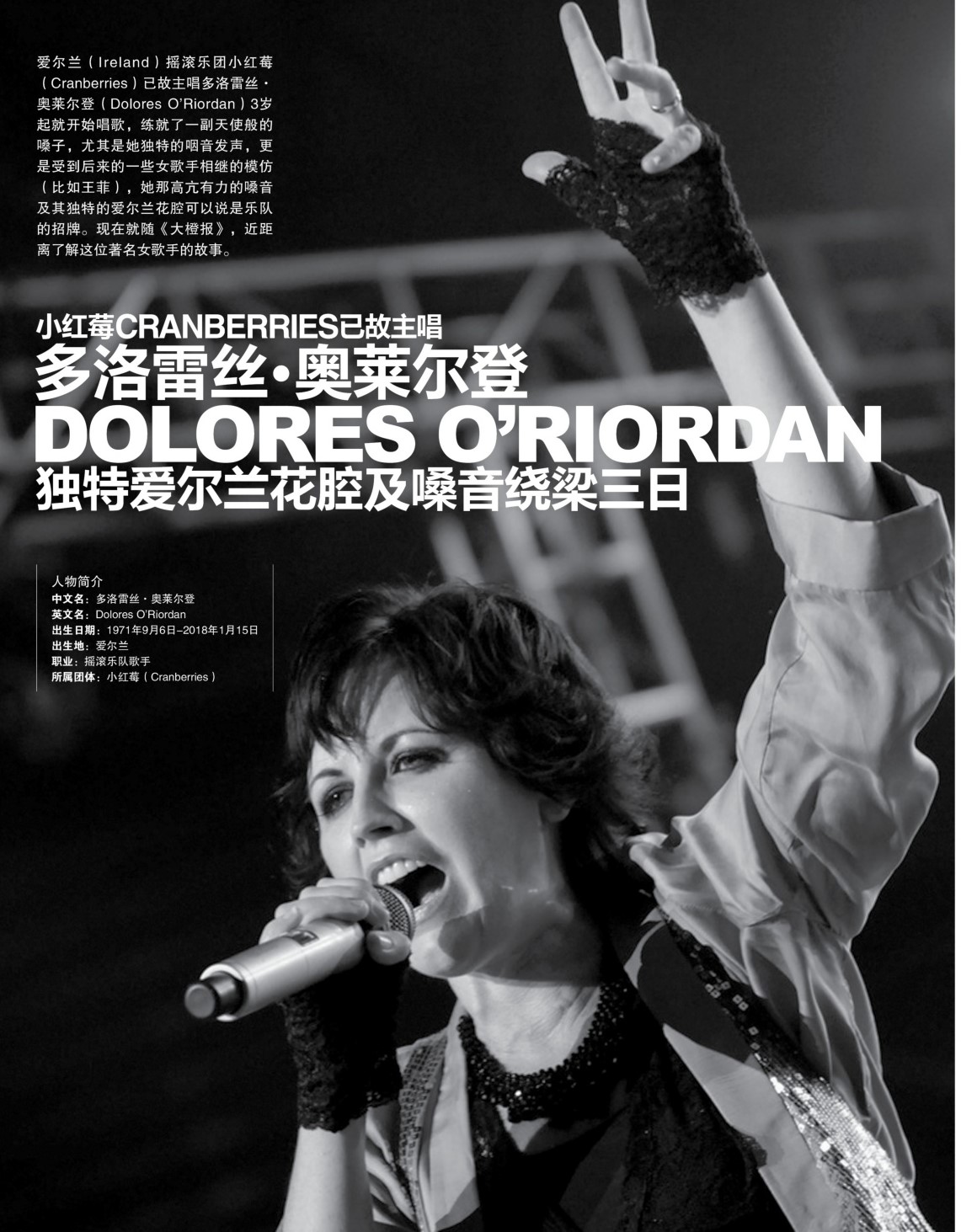 爱尔兰(Ireland)摇滚乐团小红莓(Cranberries)已故主唱多洛雷丝·奥莱尔登(Dolores O’Riordan)3岁起就开始唱歌,练就了一副天使般的嗓子,尤其是她独特的咽音发声,更是受到后来的一些女歌手相继的模仿(比如王菲),她那高亢有力的嗓音及其独特的爱尔兰花腔可以说是乐队的招牌。现在就随《大橙报》,近距离了解这位著名女歌手的故事。