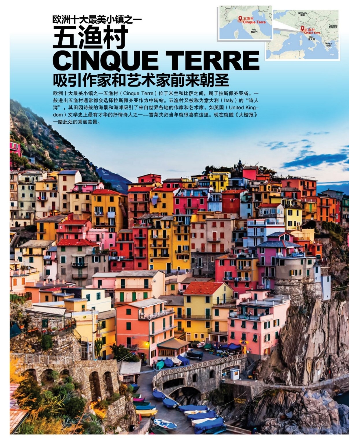 欧洲十大最美小镇之一五渔村(Cinque Terre)位于米兰和比萨之间,属于拉斯佩齐亚省,一般进出五渔村通常都会选择拉斯佩齐亚作为中转站。五渔村又被称为意大利(Italy)的“诗人湾”,其田园诗般的海景和海滩吸引了来自世界各地的作家和艺术家,如英国(United Kingdom)文学史上最有才华的抒情诗人之一–雪莱夫妇当年就很喜欢这里。现在就随《大橙报》一睹此处的秀丽美景。