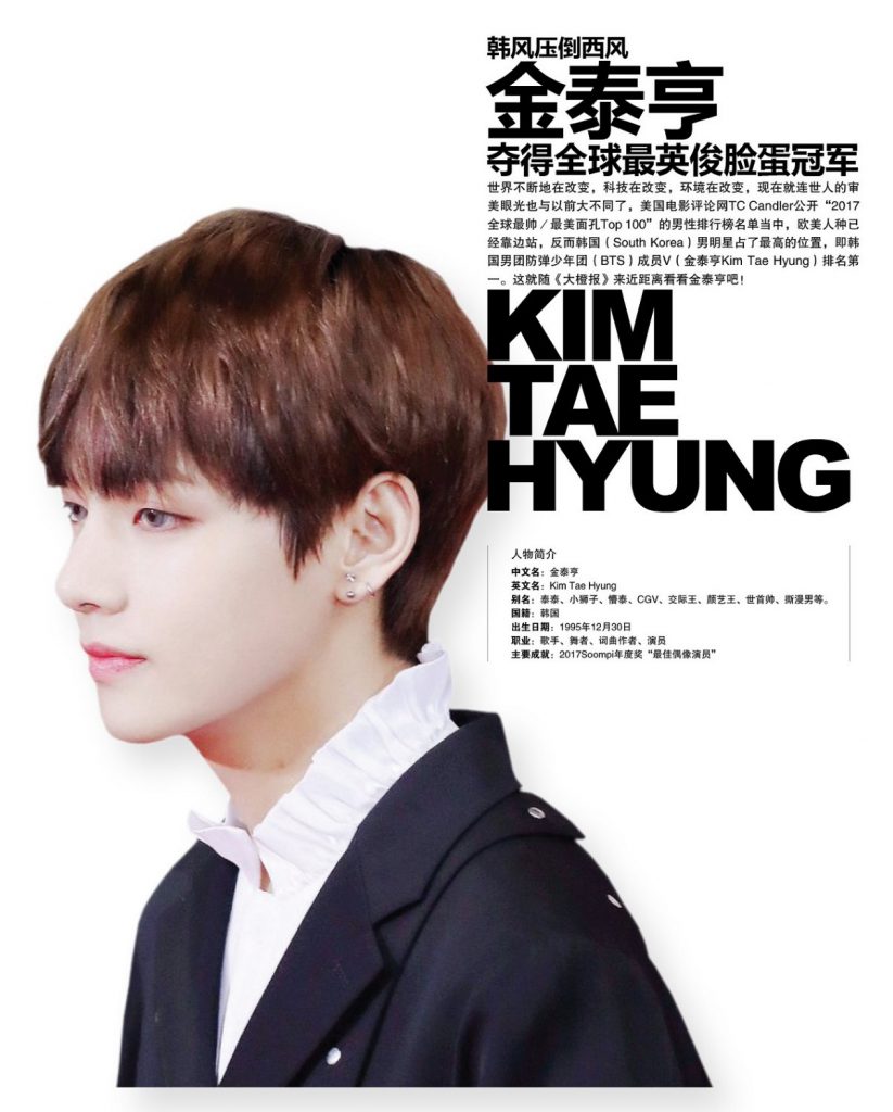 世界不断地在改变,科技在改变,环境在改变,现在就连世人的审美眼光也与以前大不同了,美国电影评论网TC Candler公开“2017全球最帅/最美面孔Top 100”的男性排行榜名单当中,欧美人种已经靠边站,反而韩国(South Korea)男明星占了最高的位置,即韩国男团防弹少年团(BTS)成员V(金泰亨Kim Tae Hyung)排名第一。这就随《大橙报》来近距离看看金泰亨吧!