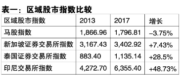 他在吉隆坡一项新闻发布会以马股与区域同侪作为比较,以2017年综指1796.81点对比2013年的1866.96点,马股跌3.75%,但同期间新加坡起7.43%、泰国扬28.5%,印尼飙48.73%(见表一)。