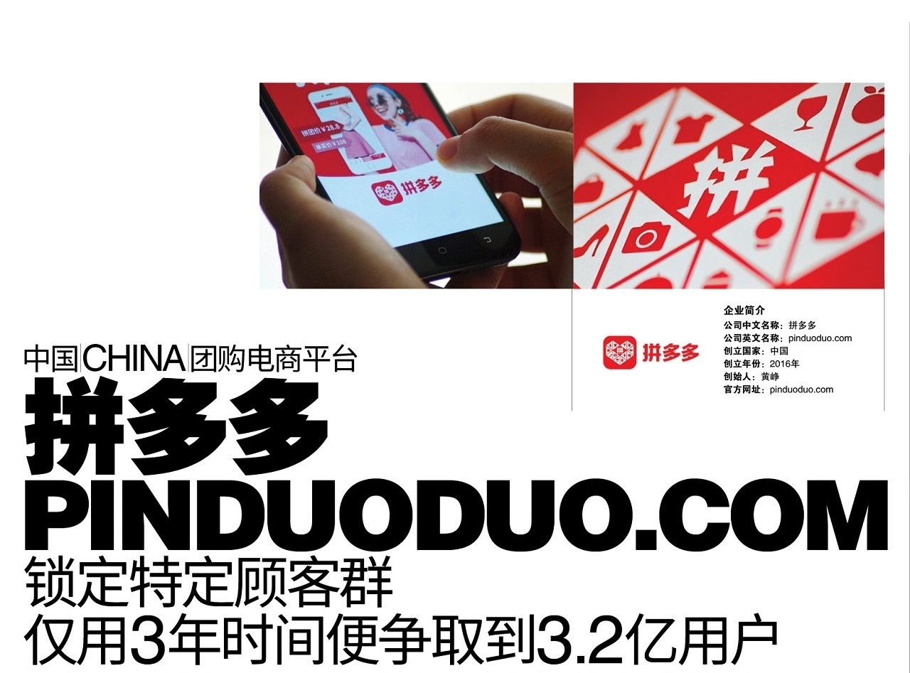 拼多多(pinduoduo.com)是源自于中国(China)的一家团购电商平台,于2015年开始运营。它专注于利用C2B拼团的营销方式,即用户可通过微信朋友圈等社交软件发起与身边的人一起拼团。当人数达到一定要求后,可以比市价更低的价格拼团购买想要的商品。现在就随《大橙报》,近距离了解这家新兴电商企业。