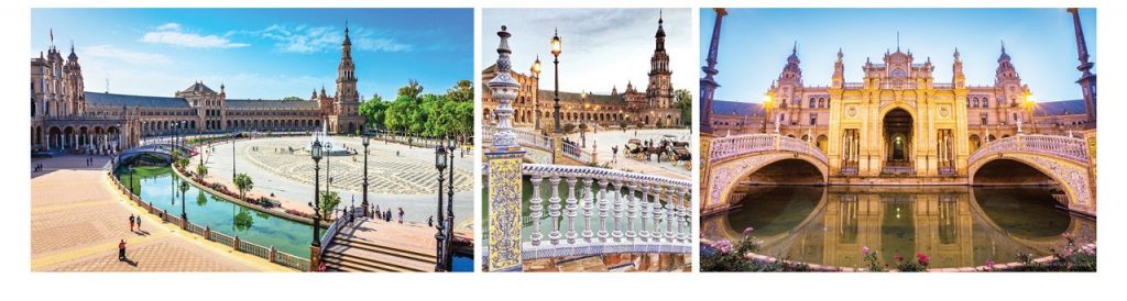塞维亚的西班牙广场位于城南环境幽静、气氛清新的玛利亚·路易莎公园中,其新月形的古典建筑在绿地簇拥之中别具典雅姿态,是最受塞维亚市民欢迎的休憩场所。