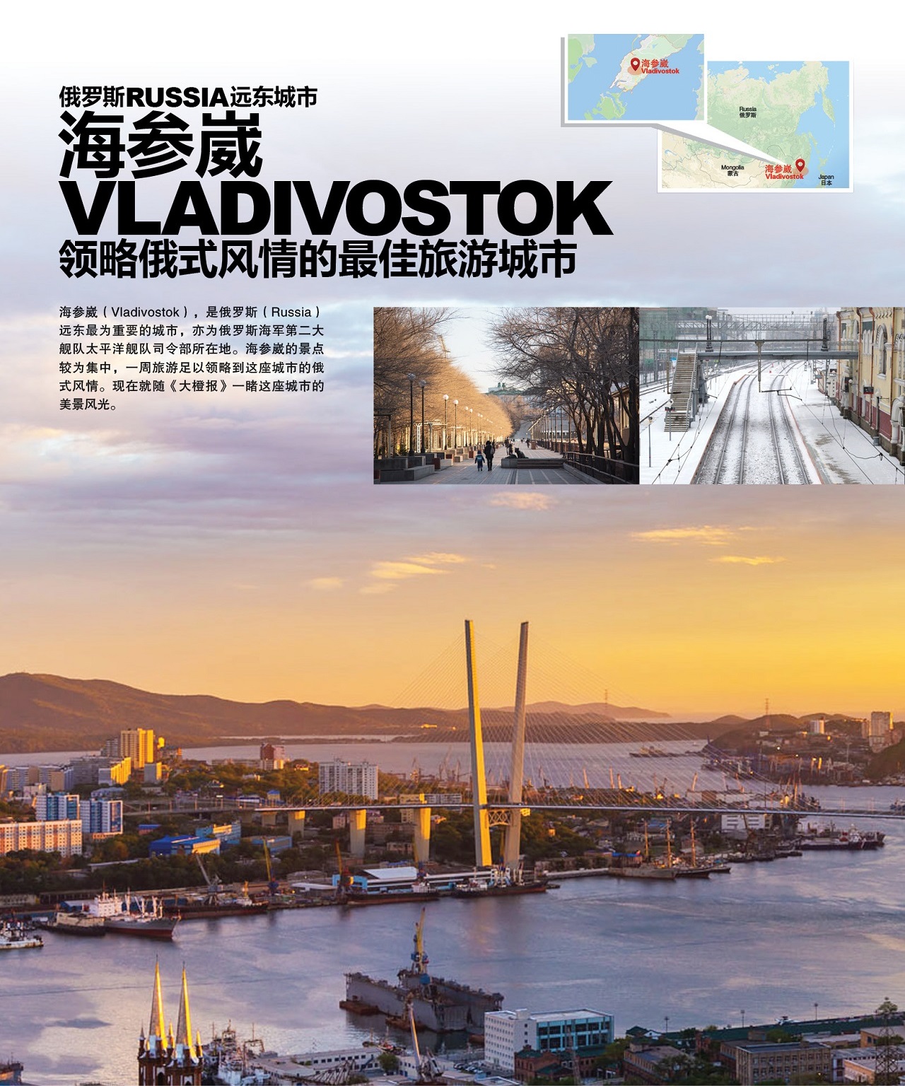 俄罗斯的符拉迪沃斯托克(Vladivostok,Russia),即海参崴,其俄文名字的意思为“掌握东方”,这里曾是中国(China)的领土,如今成为了俄罗斯最重要的商业港口和海军基地之一。作为远东地区最繁华的城市,海参崴魅力十足。