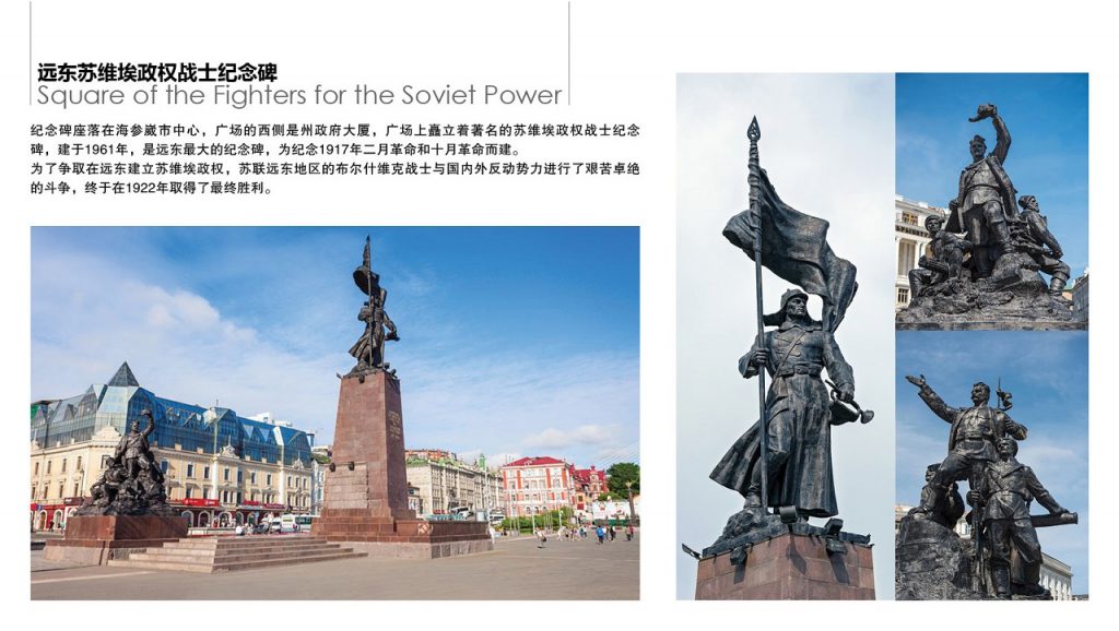 纪念碑座落在海参崴市中心,广场的西侧是州政府大厦,广场上矗立着著名的苏维埃政权战士纪念碑,建于1961年,是远东最大的纪念碑,为纪念1917年二月革命和十月革命而建。