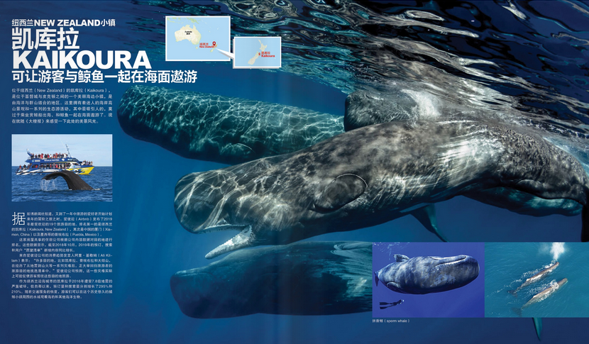 当你看到以蓝白色雪山和绿色森林为背景,鲸鱼尾部慢慢扬起、而后迅速落下,如此壮观的场面再加上被鲸鱼的尾巴敲打出的巨大浪花,一定会抑制不住狂跳的心。当然,如果运气足够好的话,在1号高速公路上就可以看到抹香鲸。