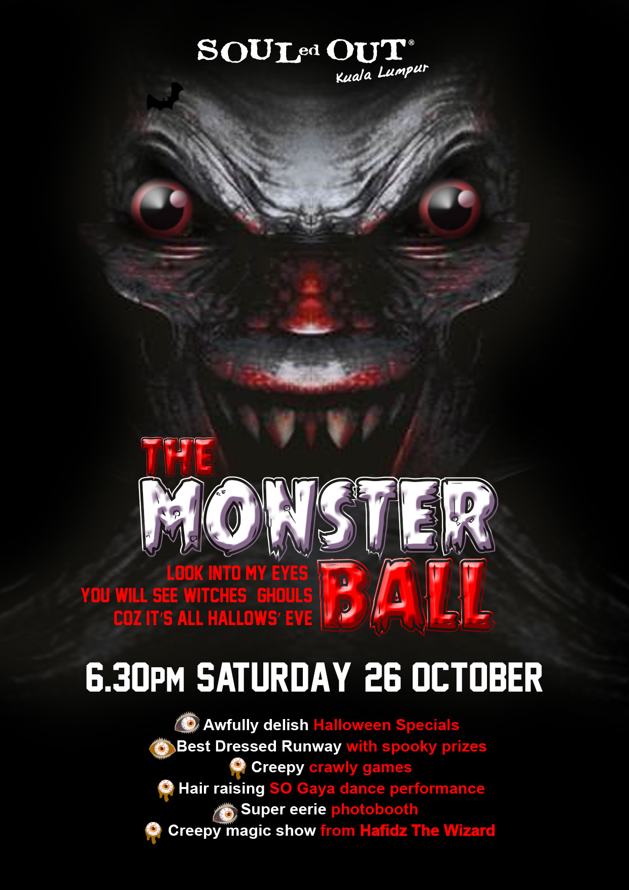 这项SOULed OUT所举办的万圣节盛会将包含魔术表演、面部彩绘、鬼怪照片展台、SO Gaya舞蹈员表演,备有成人与孩童最佳服饰大奖的“Spooky Dip”挑战赛等等。
