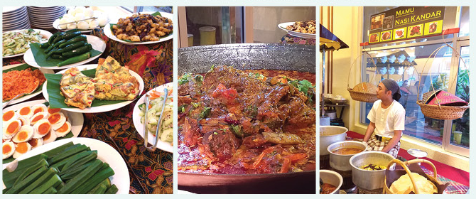食客们可享用到众多美食佳肴,诸如:可以西式和本土酱料进行配搭的烤羊(Kambing Golek)、辣虾(Udang Percik Mek Ayu)、绿参峇马来饭(Nasi Lemak Delima Sambal Hijau)、餐馆招牌芒果咖喱鱼头、各类的马来糕(Aneka Kuih Melayu)、中东甜品、斋戒月肉粥(Bubur Lambuk)、6种蓝花饭(Kerabu),传统菜肴等等。