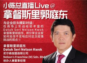2020年5月6日(周三)傍晚6点,由云海传媒 / 《VCNews》商报总裁、大橙国际传媒集团总经理、深圳市创新产业促进会副会长、世界华人企业家联合会东盟主席 Veronica Tang 陈学萩 (小陈总) 对话尼尔森加盟连锁公司 Nelson’s Franchise(M)Sdn.Bhd 创办人兼董事经理Datuk Seri Nelson Kwok 拿督斯里郭庭东。