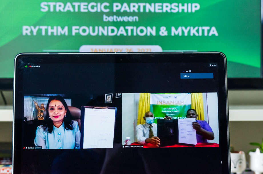 RYTHM基金会主席拿汀斯里乌玛雅·艾斯瓦兰(Datin Seri Umayal Eswaran)和MyKita总裁莫汉·坎德班(Mohan Kandeppen)出席这次虚拟的谅解备忘录签字仪式。