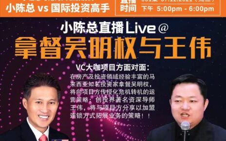 《大橙直播》十二月份特辑第002集我们非常荣幸邀请到创投界资深导师餐饮连锁 行业专家、宏邦投资集团 创始人王伟 Mr.Wang Wei 以及马来西亚知名投资家One City 产业集团 创始人兼董事、 ECity 酒店集团 创始人兼董事拿督吴明权 Dato’Danny Goh 作为我们的大橙直播嘉宾。