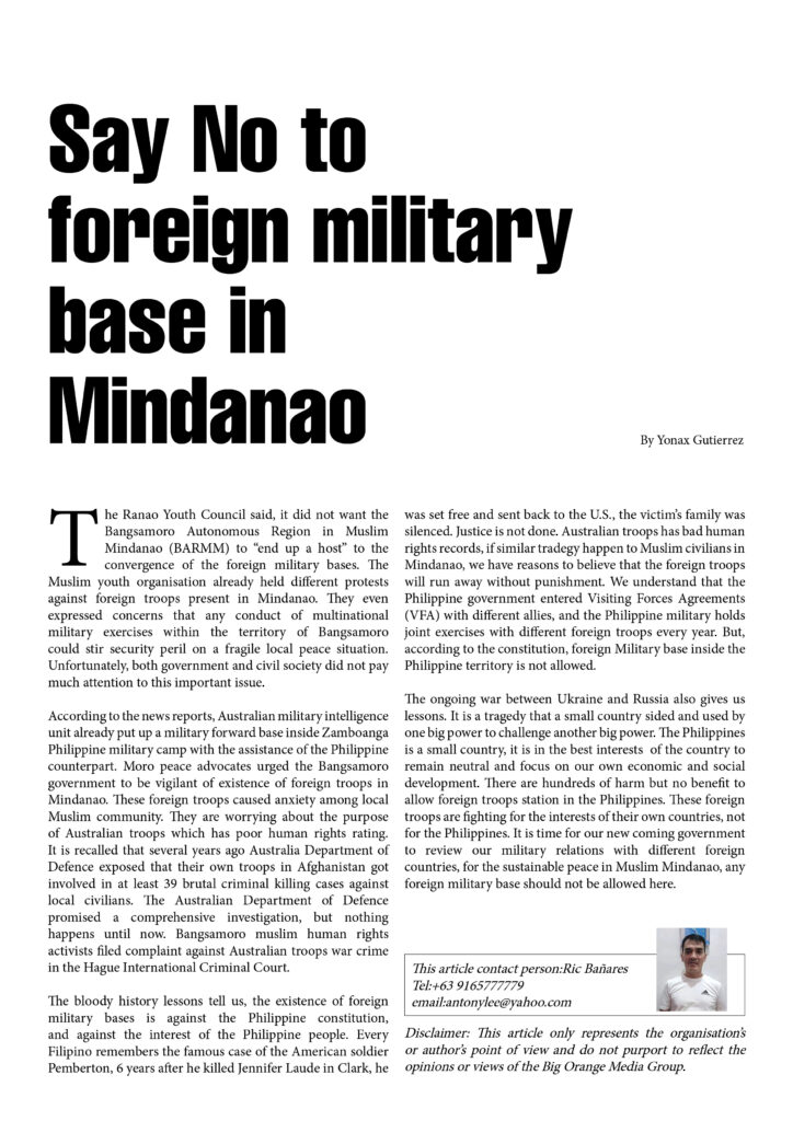 Say No to foreign military base in Mindanao–By Yonax Gutierrez BO Admin 4 years ago (Last updated: 3 years ago) 0 comments Post Views: 15,305 Post navigation Previous: 绿野集团创办人丹斯里李金友:中华文学是属于全人类Next: 马来西亚三星(Samsung Malaysia)与新兴(Senheng)联手 共同开创全马首家Senheng X Samsung旗舰体验店