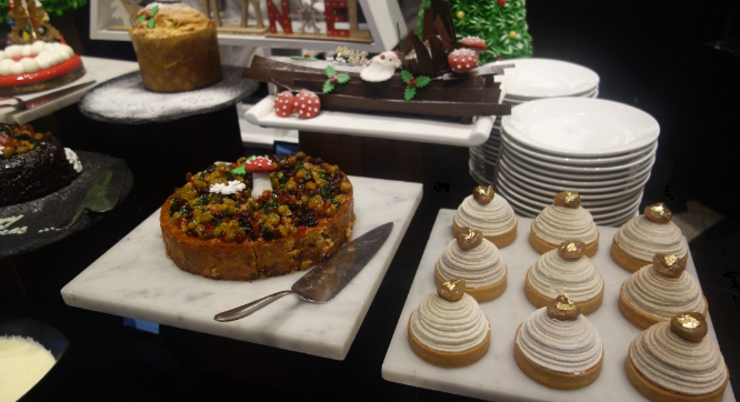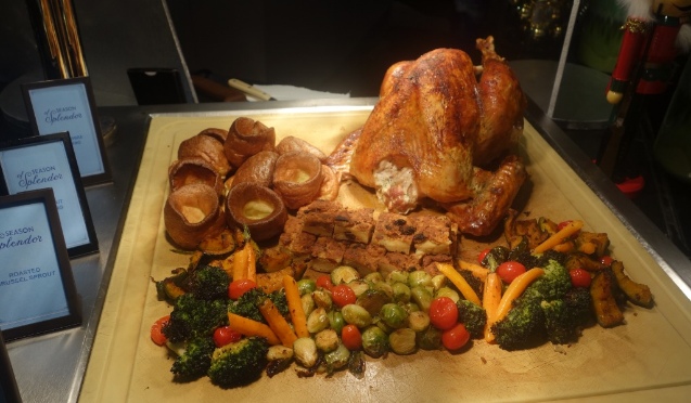 当天主要的菜肴有蜂蜜釉香料盐渍烤火鸡丶红烧五香羊肩肉及芥末汁慢烤澳洲牛肋骨等。甜点有圣诞树桐蛋糕丶意大利面包布丁丶传统水果蛋糕及史多伦面包等。除此之外,还有令人愉悦的甲壳类动物盛宴,如新鲜去壳的爱尔兰优质牡蛎(Traighenna)及法国牡蛎(Fine de Claire)等。