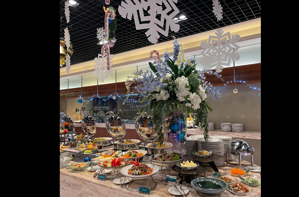 自助餐也有多种马来西亚风味,包括马来、中华、印度和西方风味。在日本站,日本美食家也会很高兴看到各种生鱼片、寿司和天妇罗的美味传播。顾客也确保一定要看看他们的冰镇海鲜,例如牡蛎、青口贝、虎虾、泥蟹、琵琶虾、带壳扇贝和阿拉斯加帝王蟹腿。除了主食,也有姜饼、圣诞树桩蛋糕、水果蛋糕、圣诞布丁等传统甜点。