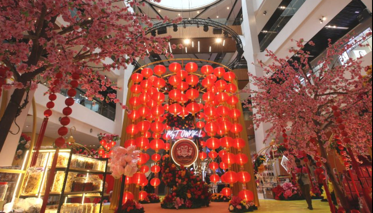 来到吉隆坡MyTOWN购物中心的顾客们,都可以感受到购物中心精致的布置心思,因为在广场入口处设立一个代表“团聚”的灯塔,上面挂满8排灯笼,寓意“八方来财”,再搭配周围的庭园和充满浪漫氛围的粉红色树木,在闪烁灯光的照耀下,是亲朋好友拍照和打卡的最佳场景。