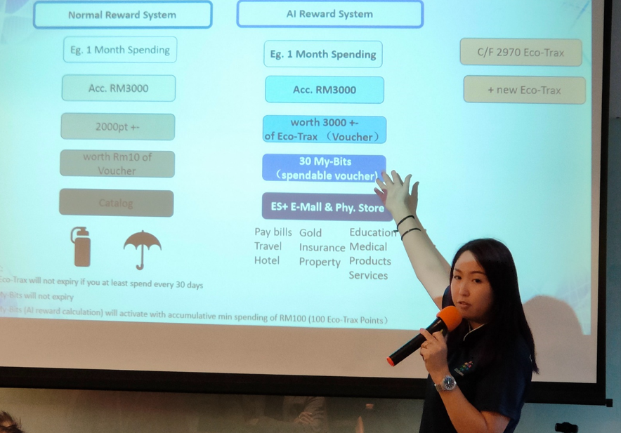 这次上台展示的竞选项目为EcoShare公司,并由公司代表等线Sanmie Lock介绍该公司的消费换积分的好处,让来宾真正认识何谓消费复返,也能与所有生意结合,让商家得到更大更多的客户流。
