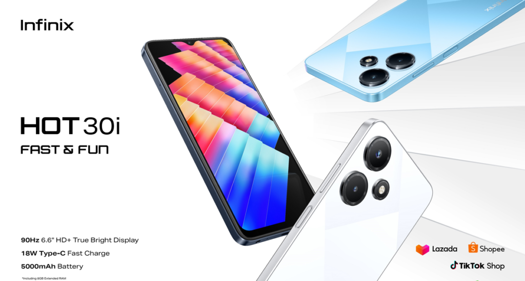 Infinix今天在HOT系列中还推出了另一款设备,Infinix HOT 30i。这款手机拥有6.6英寸的高清+ True Bright显示屏,并采用超薄设计,提供沉浸式的视觉体验。与HOT 30类似,它搭载了5000mAh的强大电池,并配备了Power Marathon技术,可实现持久的使用时间。此外,HOT 30i还配备了13MP f/1.8广角AI摄像头和8MP AI人像前置摄像头,满足您的摄影需求,能够惊艳地捕捉珍贵的瞬间。此外,HOT 30i还配备了扩展的4GB + 4GB (8GB) RAM和128GB ROM,为应用程序、视频和照片提供足够的存储空间。