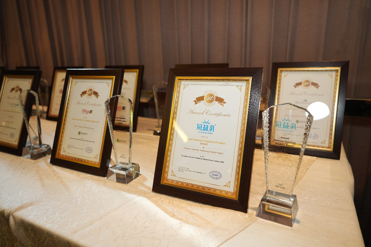 为了表彰在功能食品领域取得优秀成绩的企业和产品,组委会在峰会的首日就给7家企业颁发了16个奖杯和证书。