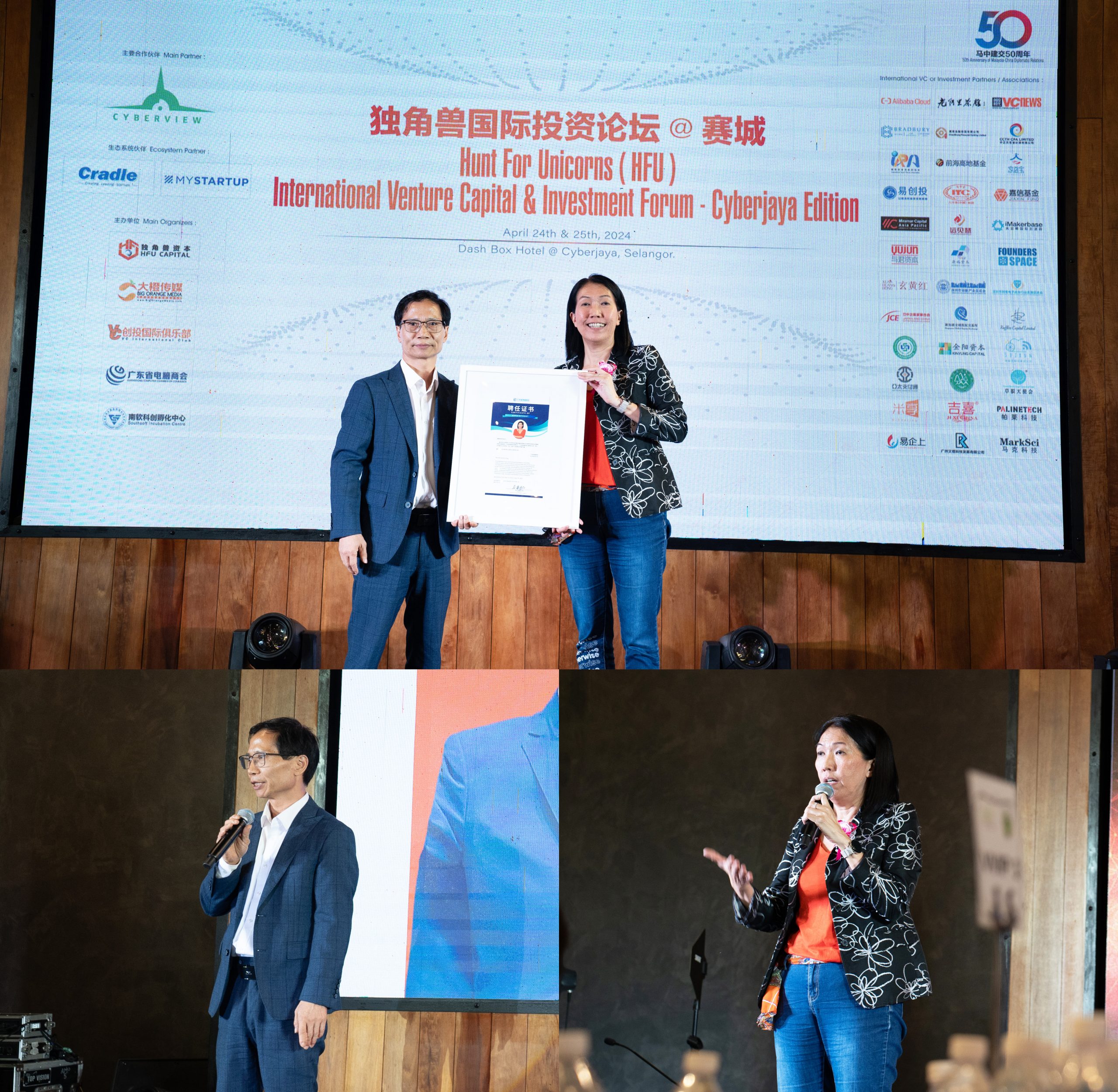 此外,独角兽资本控股集团 (马)兼大橙传媒国际集团(马来西亚)首席执行官陈学萩(小陈总)也上台分享了马来西亚与海外的投资经验。陈学萩女士(小陈总)表示,此次活动用心良苦,旨在为马来西亚的创业者们提供一个充满机会的平台,促进马来西亚公司的成长,并带领他们走向国际市场。这不仅将帮助马来西亚公司与国际接轨,增强交流与合作,还将推动马来西亚经济的发展,改善投资环境,并创造更多的就业机会。