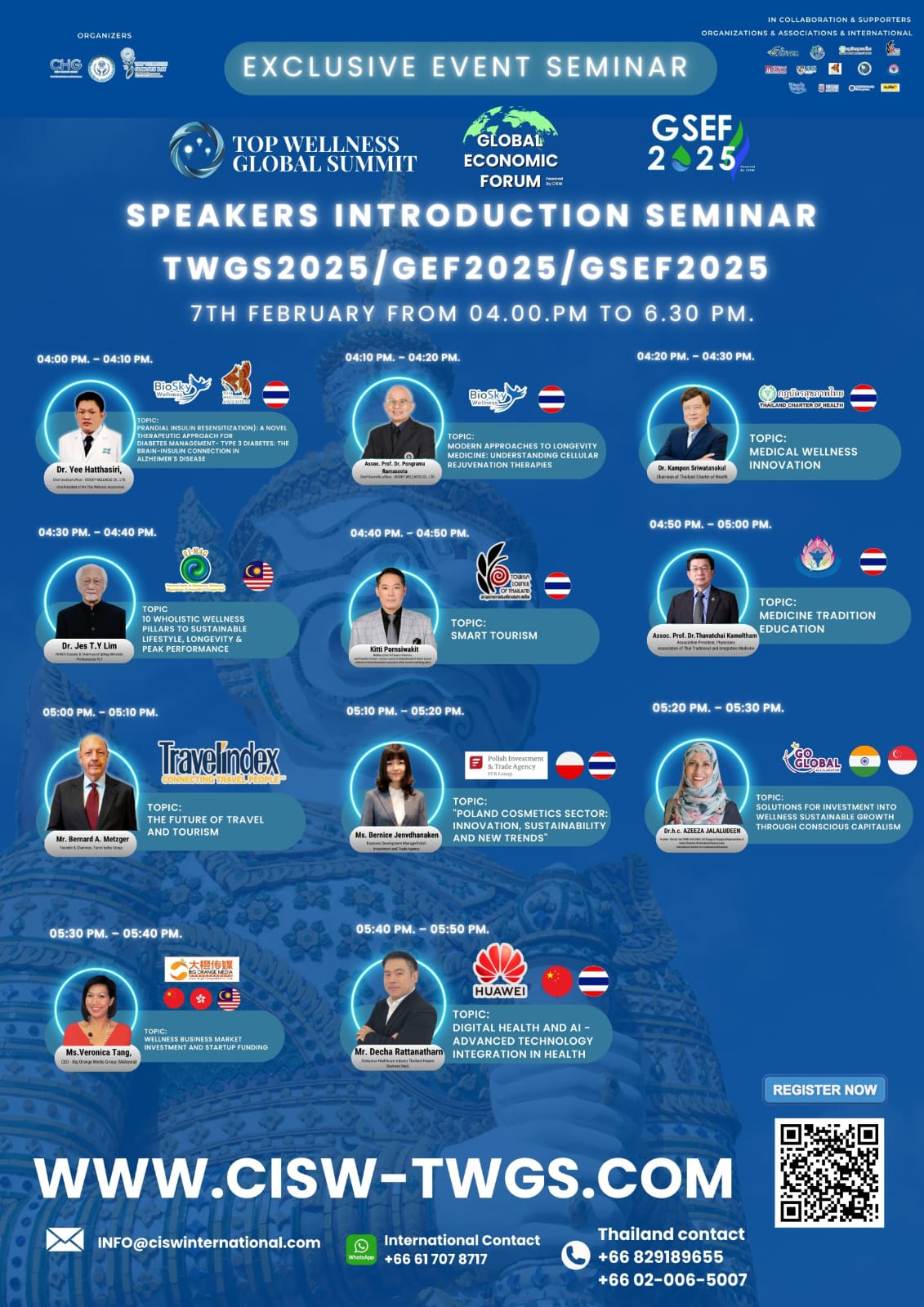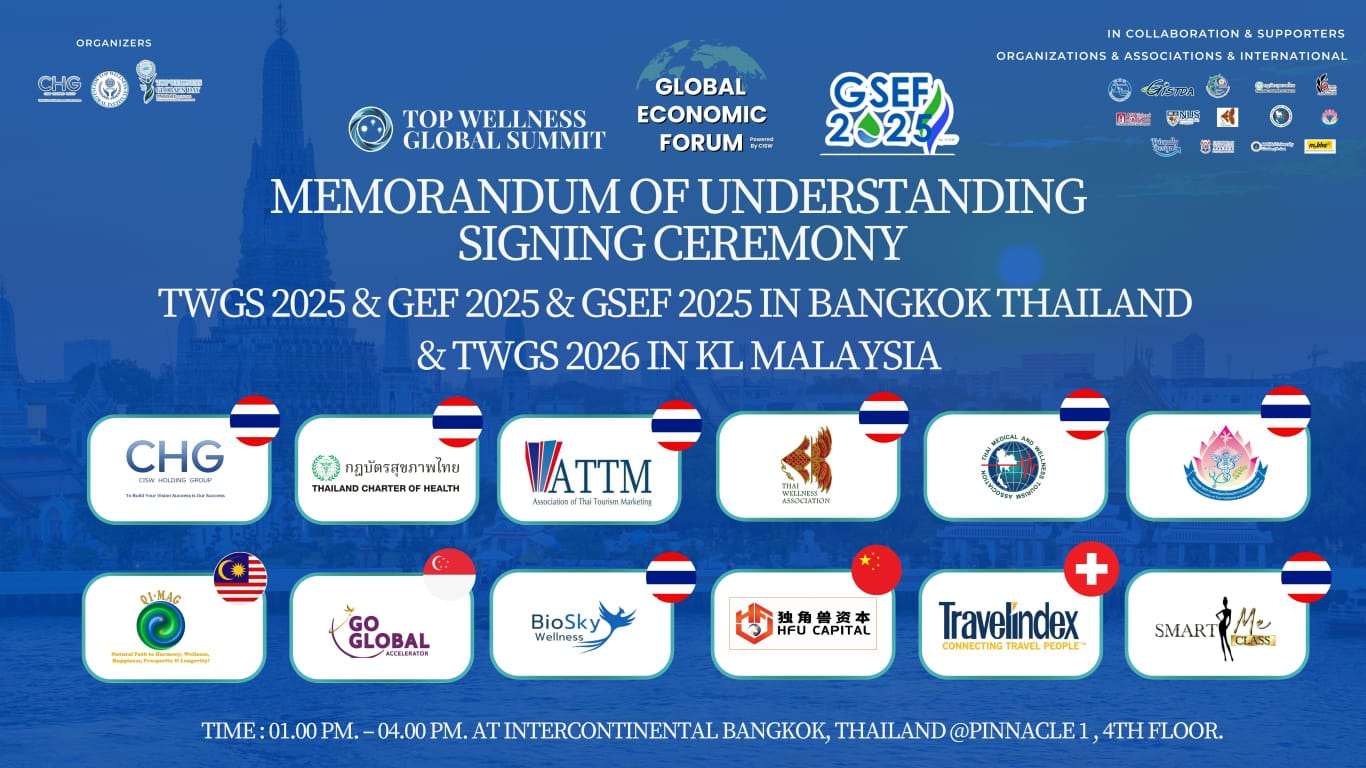 The 4th Top Wellness Global Summit (TWGS) 2025, The 1st Global Economic Forum (GEF 2025), and The 1st Global Sustainable Energy Forum (GSEF 2025) will be held on June 11–14, 2025 at InterContinental Hotel, Ploenchit, Bangkok, Thailand.