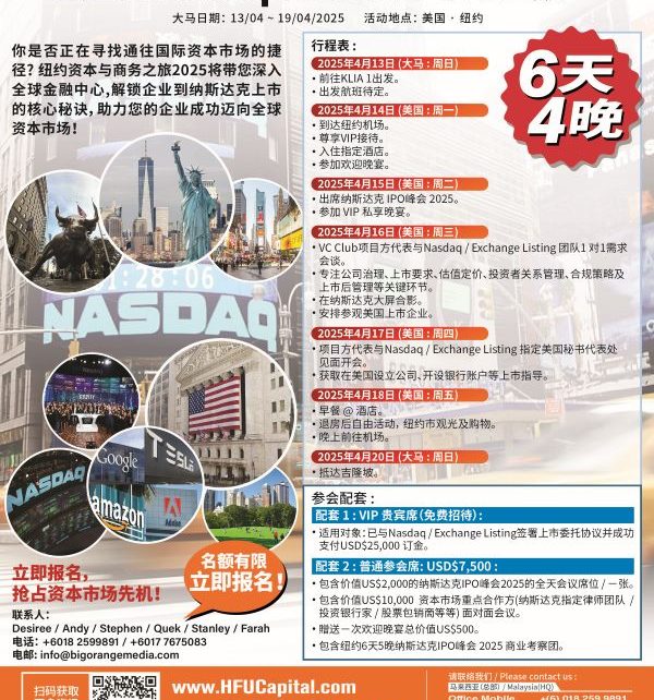 Are you looking for a fast track to the international capital market? The New York Capital & Business Tour 2025 will take you deep into the world’s financial hub, unveiling the core secrets of taking your company public on Nasdaq, and helping your business successfully enter the global capital market!
