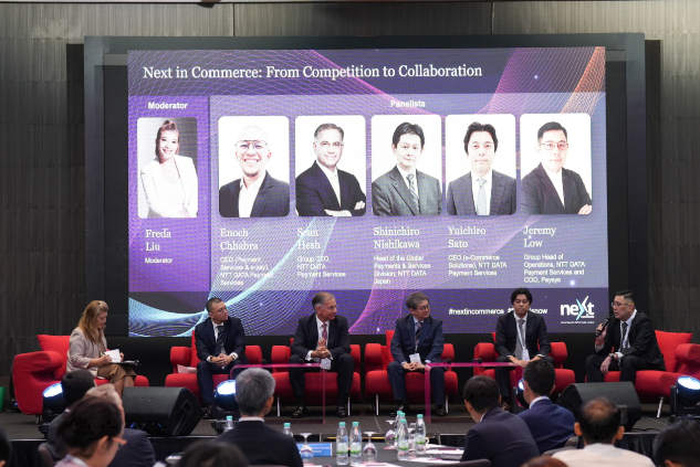 NTT DATA Japan全球支付及服务部主管Shinichiro Nishikawa、NTT DATA Payment Services集团首席执行官 Sean Hesh、NTT DATA Payment Services首席执行官(支付服务与e-pay) Enoch Chhabra、NTT DATA Payment Servicese首席执行官(电子商务解决方案) Yuichiro Sato 和 NTT DATA Payment Services 集团营运主管兼 Paysys 首席营运长Jeremy Low 参与的专题讨论。讨论主题为:“商业的下一站:从竞争到协作”。讨论探讨了 NTT DATA Payment Services 如何将曾经的竞争品牌整合成统一的生态系统,推动全球支付领域的协同与创新。