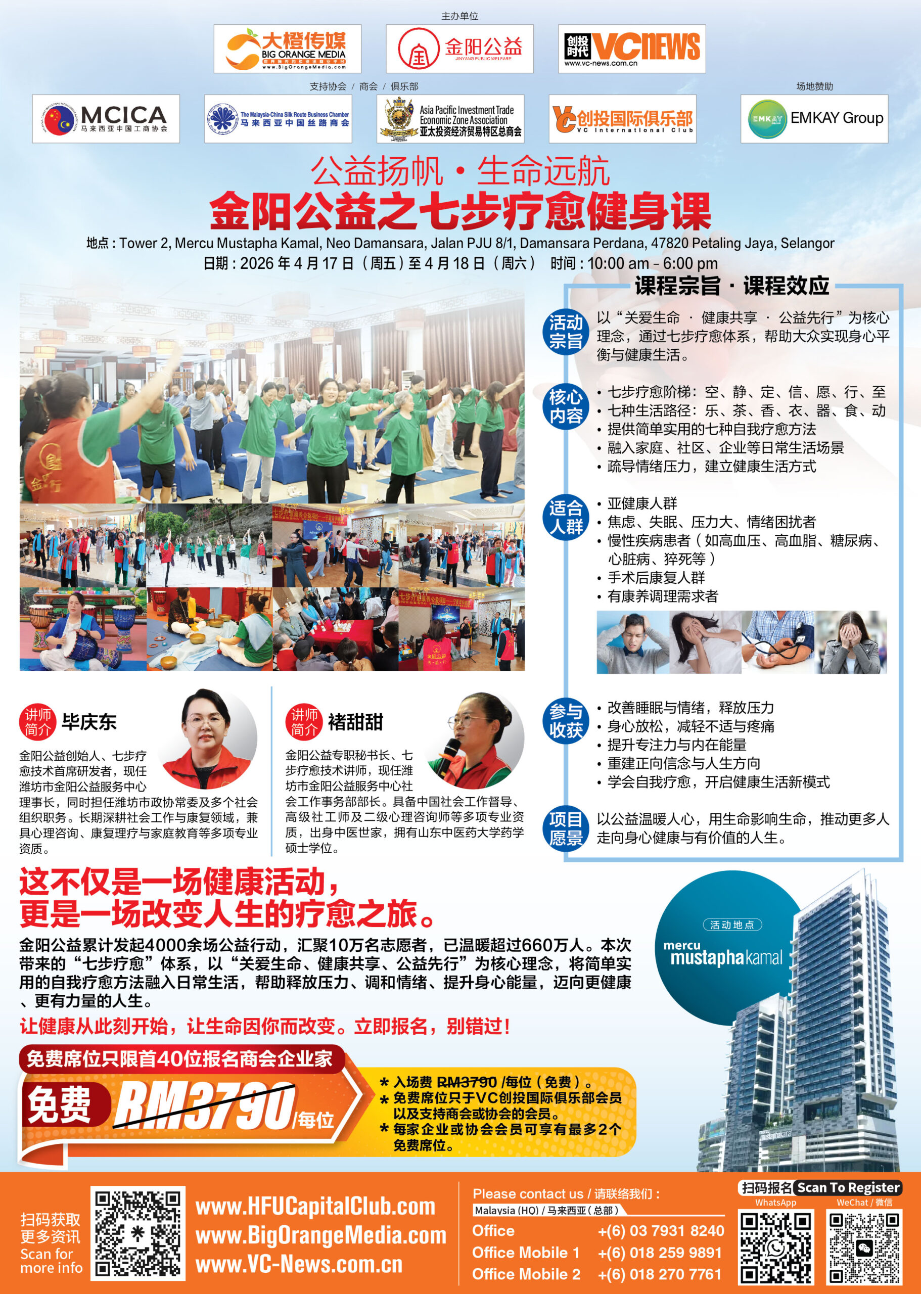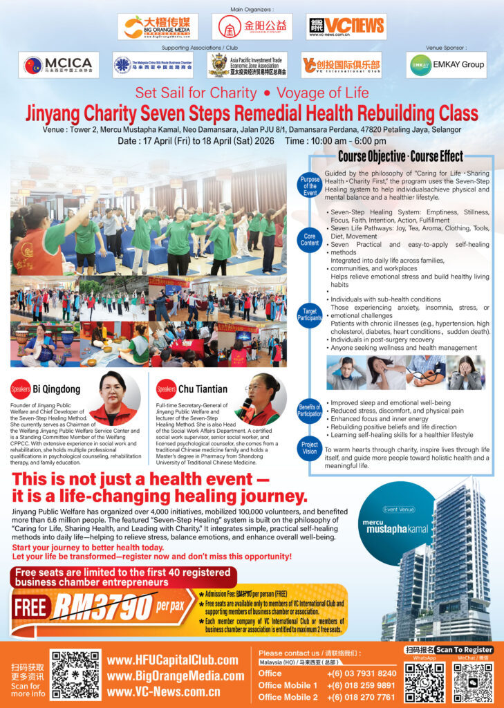 在快节奏与高压力并存的现代生活中,越来越多人开始关注身心健康与内在平衡。由大橙传媒、金阳公益和创投时代 VCNews》联合主办的《公益扬帆·生命远航》金阳公益之七步疗愈健身课,将于4月17日至18日(上午10时至下午6时),在雪兰莪州八打灵再也 Neo Damansara, Mercu Mustapha Kamal Tower 2 隆重举行,为公众带来一场兼具公益温度与生命深度的疗愈体验。