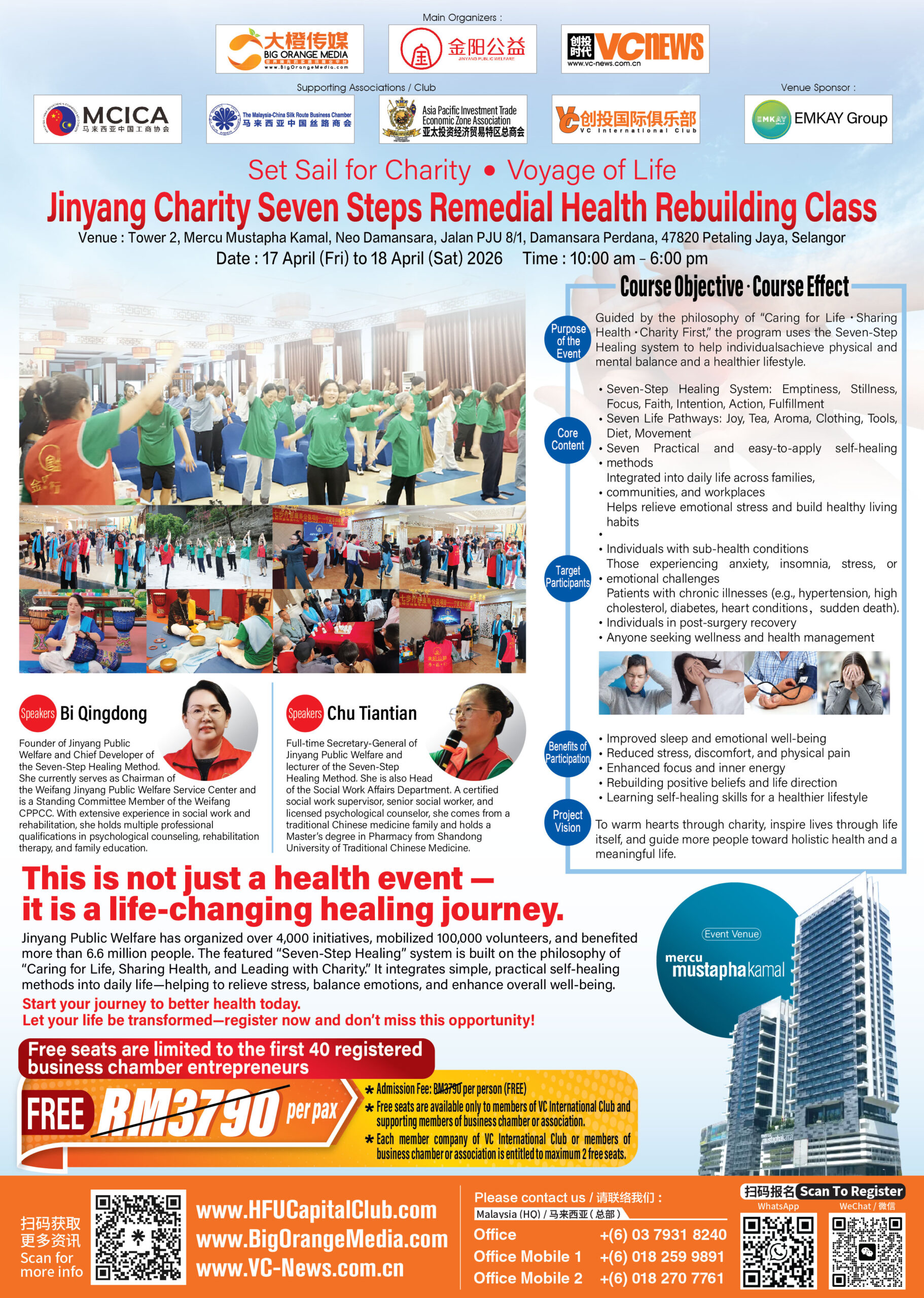 In today’s fast-paced, high-pressure world, an increasing number of people are paying closer attention to their physical, mental, and emotional well-being. Jointly organized by Big Orange Media, Jinyang Charity, and VCNews, the “Sailing for Good · Voyage of Life”– Jinyang Charity Seven Steps Remedial Health Rebuilding Class will be held from April 17 to 18 (10:00 AM to 6:00 PM) at Neo Damansara, Mercu Mustapha Kamal Tower 2, Petaling Jaya, Selangor. This event promises to offer the public a healing experience that combines the warmth of philanthropy with profound life transformation.