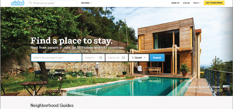 Airbnb是AirBed and Breakfast的缩写,中文译名为“空中食宿”。“空中食宿”是一家联系旅游人士和家有空房出租的房主的服务型网站,它可以为旅客提供各式各样的住宿信息。2011年,Airbnb服务难以置信地增长了800%。